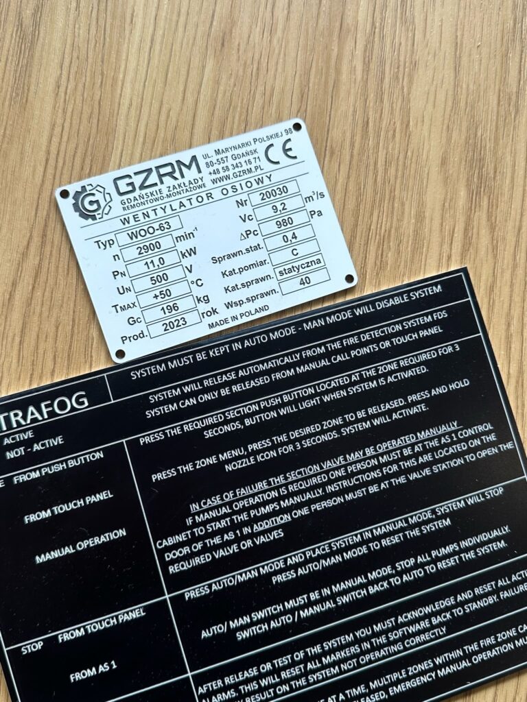 - tabliczki znamionowe dla maszyn, urządzeń i wind,