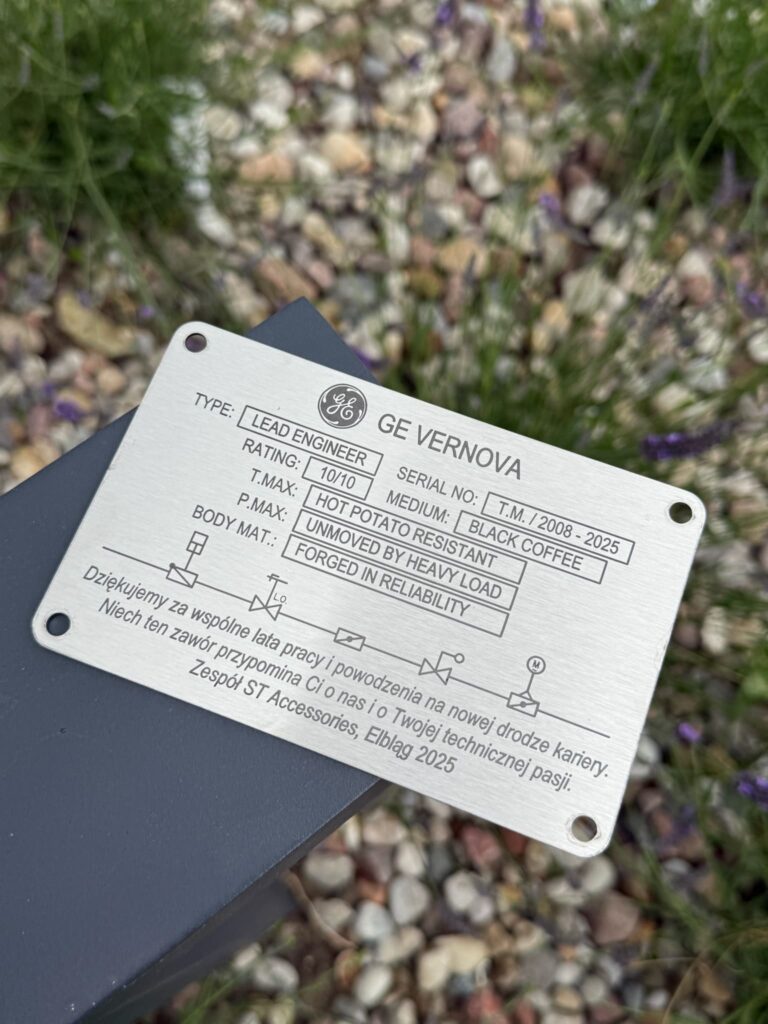 - Grawer na metalu — trwałe i wyraźne zdobienia oraz oznaczenia, jak np. tabliczki znamionowe i logotypy.