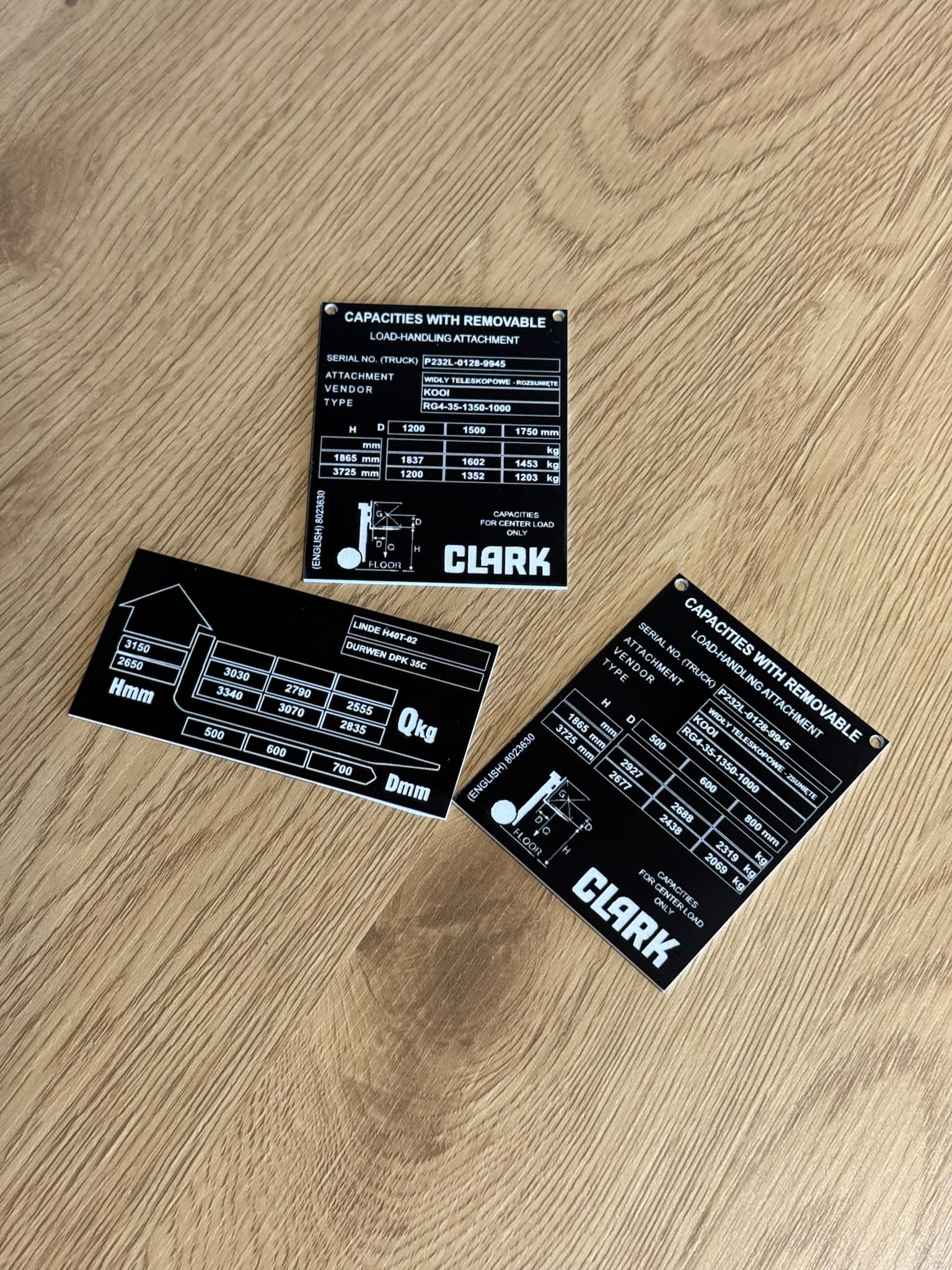 - tabliczki znamionowe dla maszyn, urządzeń i wind,